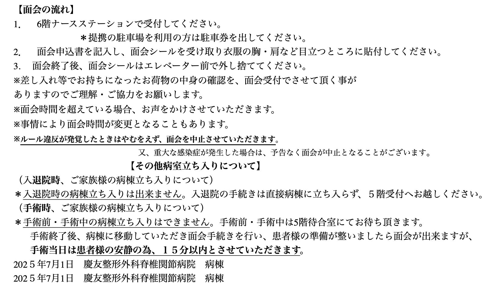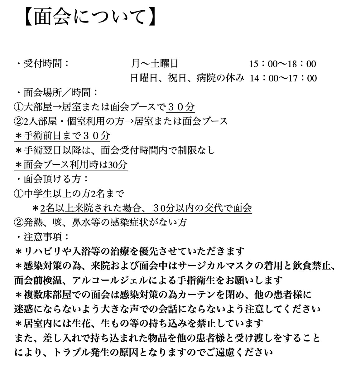 面会時間変更のお知らせ 2024.01.04 最新情報 当院の面会時間およびルールの下記のように変更いたします。 詳しくは下記をご参照ください。 ご不便をおかけいたしますが、ご理解の程よろしくお願いいたします。 前へ お知らせ一覧 次へ